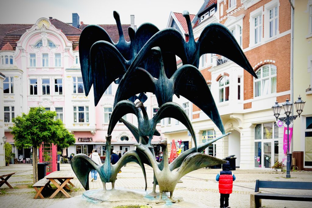 Der Gänsebrunnen befindet sich auf dem Gänsemarkt im Herforder Stadtteil Radewig, einem Platz mit sehr langer Markttradition, der bereits im frühen Mittelalter wirtschaftliche Bedeutung hatte. Der Brunnen wurde 1978 errichtet und zeigt acht bronzene Gänse, die auf einer steinernen Säule angeordnet sind und an den historischen Geflügelhandel an diesem Ort erinnern. Gestaltet wurde das Werk von dem Bildhauer Bruno Buschmann, der damit ein dauerhaftes Zeichen für Alltagsgeschichte und Stadtleben schuf. Der Gänsemarkt entwickelte sich im Laufe der Jahrhunderte zu einem zentralen Treffpunkt und wird bis heute für Feste und öffentliche Veranstaltungen genutzt. Der Brunnen ist inzwischen fest im Stadtbild verankert und gilt als eines der bekanntesten Kunstwerke in Herfords.
