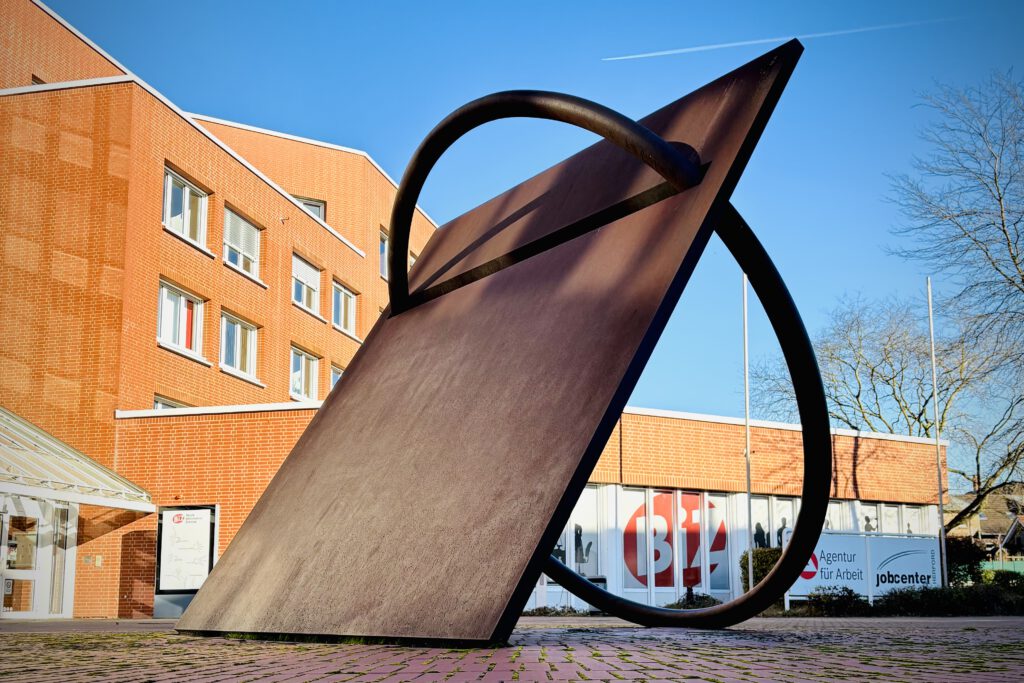 Die Skulptur „Im Dreieck 5/88“ wirkt vor allem durch das Zusammenspiel ihrer Formen: Ein Kreisring schneidet durch eine quadratische Platte und erzeugt so eine interessante Mischung aus Leichtigkeit, Masse und Bewegung. Die leichte Diagonale sorgt dafür, dass das Werk aus verschiedenen Blickwinkeln immer ein bisschen anders aussieht. Trotz ihrer auffälligen Gestaltung wirkt die Skulptur nicht übertrieben, sondern passt sich durch ihre Proportionen an jede Umgebung an. Genau dadurch verändert sie den Raum und bringt eine Mischung aus klarer Struktur und angenehmer Spannung mit sich.