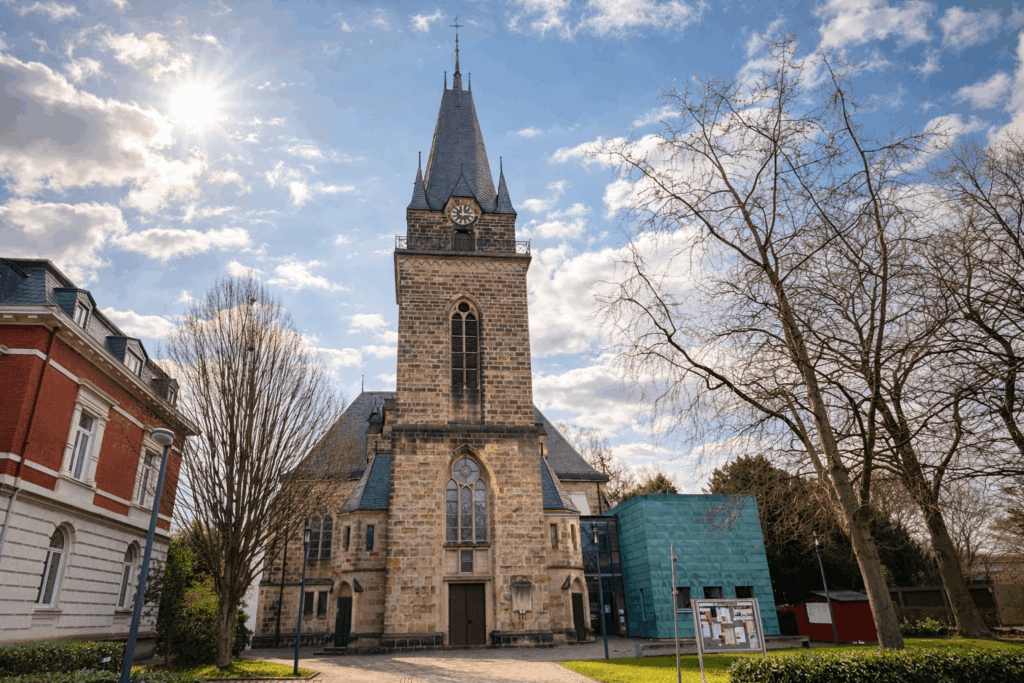 Die Petrikirche steht am Wilhelmsplatz in Herford und ist die einzige evangelisch‑reformierte Kirche der Stadt. Sie wurde 1901–1902 im neugotischen Stil errichtet und war der erste Kirchenbau, der in Herford von Anfang an als evangelische Kirche geplant wurde. Ihr kreuzförmiger Grundriss und die schlicht gehaltenen Fenster entsprechen dem reformierten Bekenntnis und schaffen einen klar gegliederten Innenraum. Der Turm ist etwa 46 Meter hoch und prägt das Stadtbild am Wilhelmsplatz.